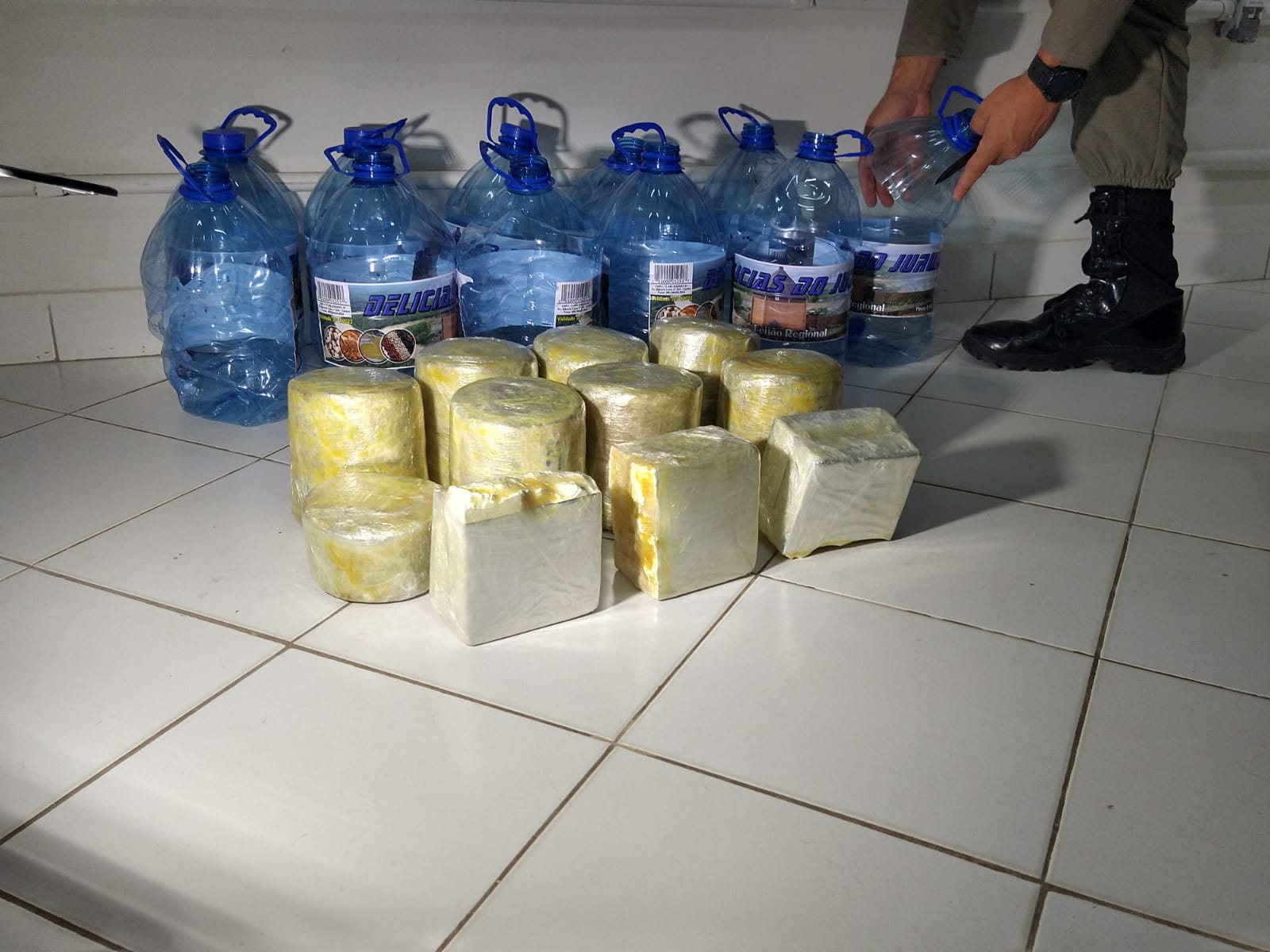 A droga foi encontrada na área externada da Rodoviária Internacional de Rio Branco. “As garrafas de cinco quilos estavam em uma caixa”, disse o Tenente PM Evandro Araújo.