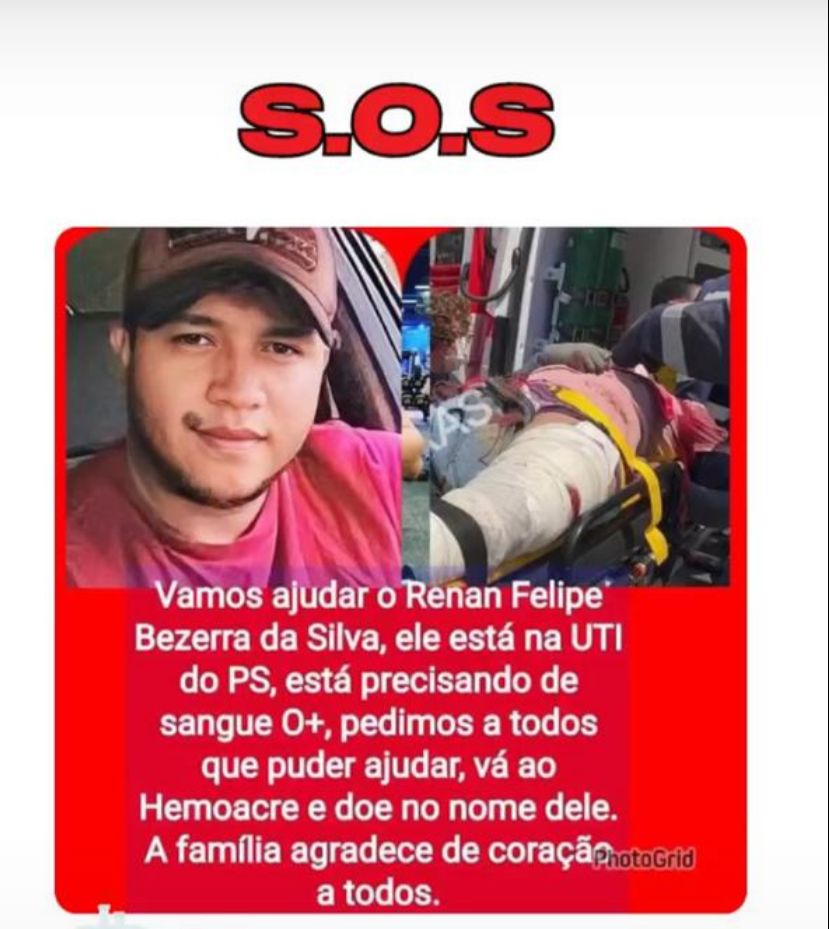 Renan Felipe permanece na UTI, em estado grave. Familiares e amigos intensificam a corrente por orações e doação de sangue. os apelos viralizam na Internet. O rapaz teve a perna arrancada em acidente envolvendo dois veículos, na Rua Rio de Janeiro, no último dia 31. A esposa, Rafaela Matos Lira, informou há pouco que, segundo os médicos, Renan é um paciente grave. “Esperamos a doação de sangue para uma cirurgia”, disse ela ao agradecer aos que estão ajudando.
