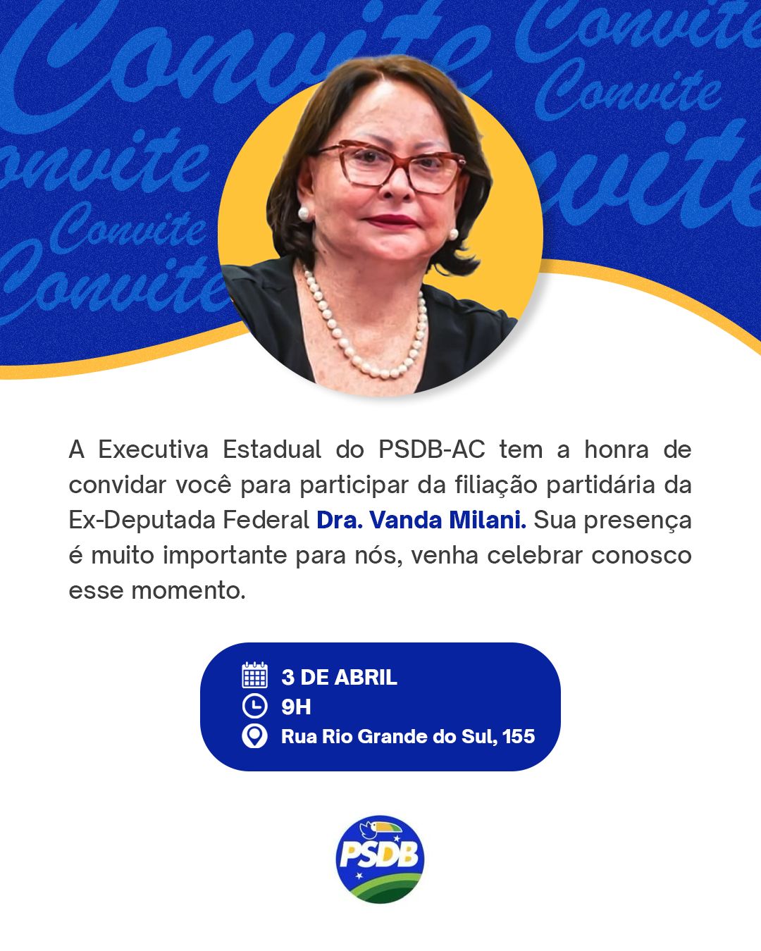 A ex-deputada federal Vanda Milani se filiará ao PSDB nesta quarta-feira. Quem está comemorando é o ex-vereador Gilson da Funerária (PSD), candidato a prefeito de Senador Guiomard. À reportagem, há pouco, ele confirmou que já teve duas reuniões com Vanda Milani, a quem foi feito o convite para ser a candidata a vice.