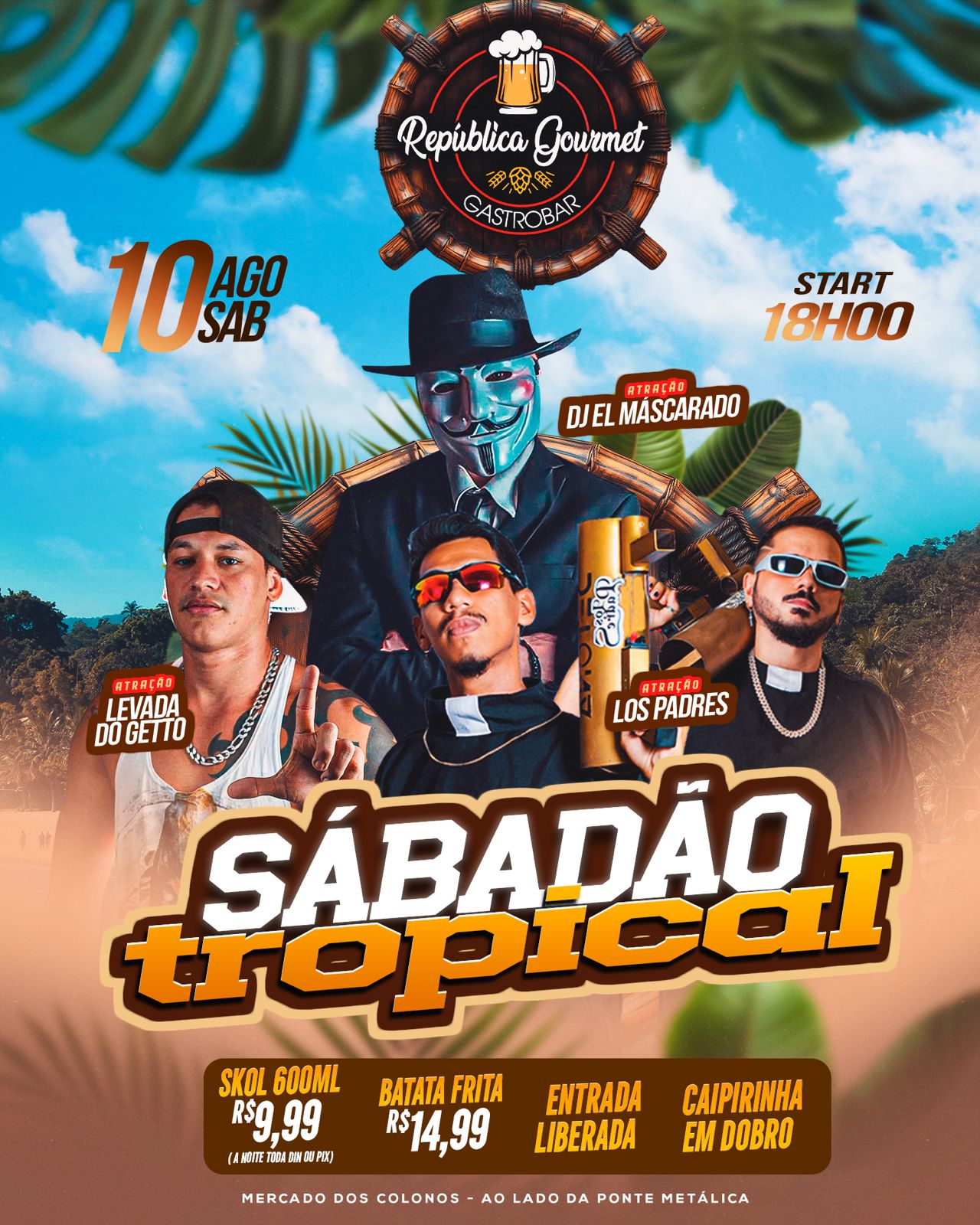 Três atrações confirmadas embalam o Sabadão Tropical, na República Gourmet, a partir das 18 horas. A Banda Levada do Guetto, o Dj El Mascarado e Los Padres se apresentarão noite adentro em mais uma noite de promoções no preço do tira-gosto e cerveja.