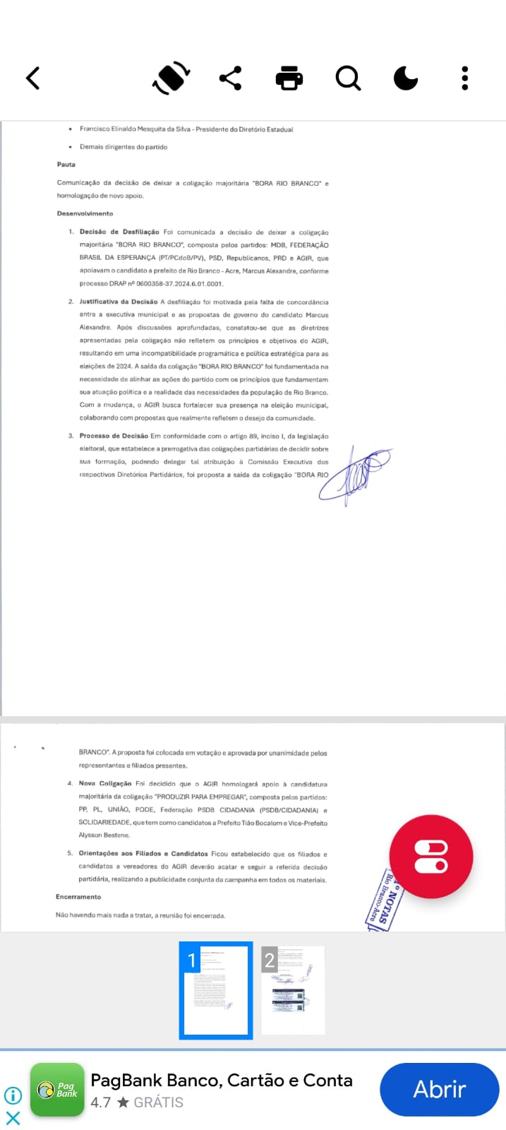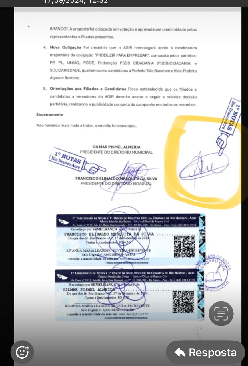 “Olá pessoal, exatamente hoje, 17 de setembro de 2024, nós estamos aqui no Partido Agir, direção municipal de Rio Branco do Agir, reunindo com os nossos candidatos e reafirmando o nosso compromisso com o Marcus Alexandre. Essa campanha do Bocalom querer comprar os nossos candidatos, comprar os partidos é uma campanha suja e que nós não aceitamos esse tipo de coisa. Então nós reunimos hoje nessa data para reafirmar o nosso compromisso, junto ao Marcus Alexandre, junto ao Agir que está aqui com os nossos candidatos, que são guerreiros e que daqui para frente nada que venha de proposta indecente, nós nem estaremos aceitando conversar. Estamos todos unidos em prol da eleição do Marcus, dia 6 de outubro, no primeiro outubro, com a ajuda do Agir, com a ajuda dos demais partidos que são sérios, nós queremos uma vitória.” – disse Pisnel.