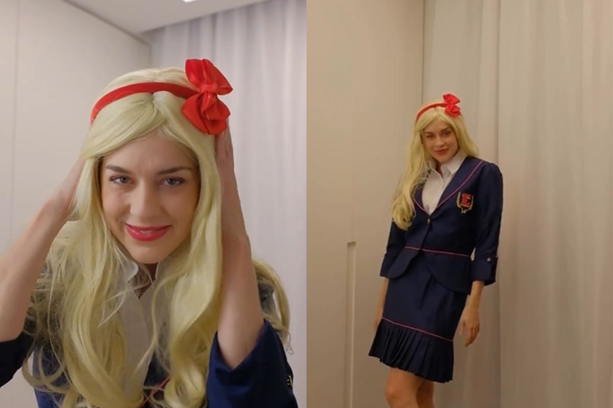 Em vídeo compartilhado nas redes sociais, Sophia usa o uniforme da personagem e veste uma peruca loira, com tiara vermelha. “É difícil ser eu #HalloweenDaGi :)”, escreveu a atriz na legenda da publicação (veja aqui).