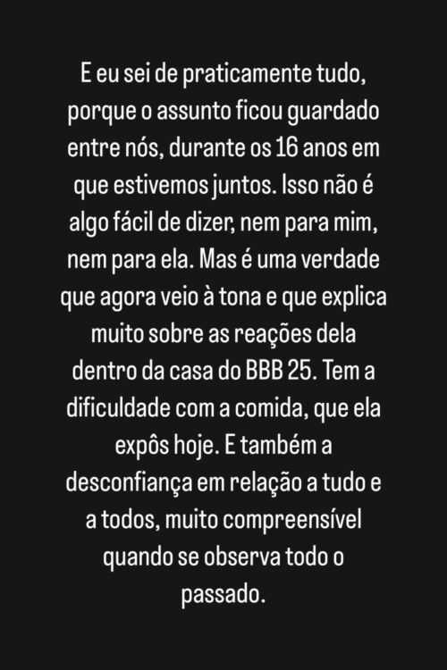 Belo ainda explicou que muitas das atitudes da ex-mulher dentro do reality show têm relação com seu passado. “Isso não é algo fácil de dizer, nem para mim, nem para ela. Mas é uma verdade que agora veio à tona e que explica muito sobre as reações dela dentro da casa do BBB 25. [Ela] Tem a dificuldade com a comida, que ela expôs hoje. E também a desconfiança em relação a tudo e a todos, muito compreensível, quando se observa todo o passado”.