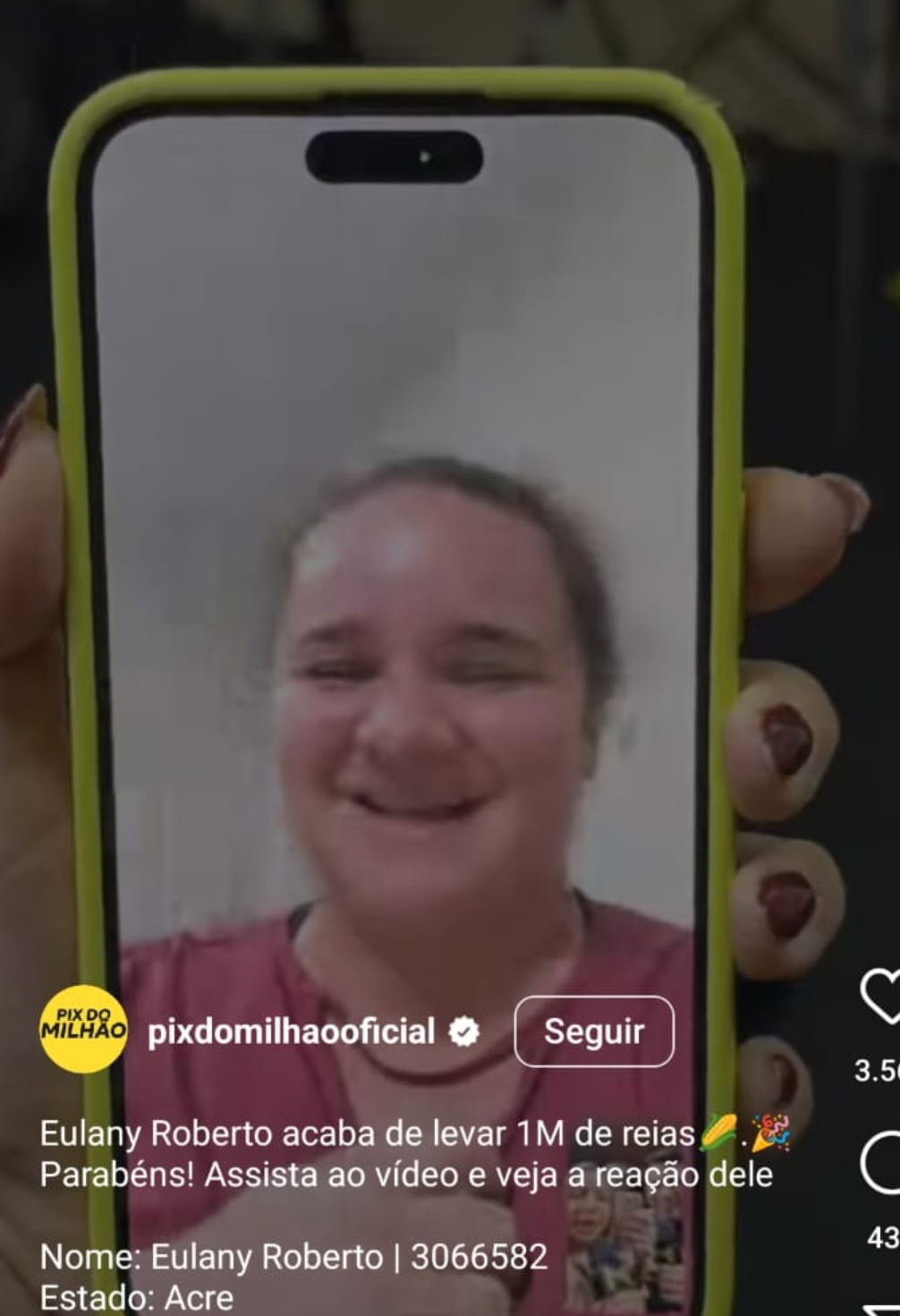 A acreana Eulany Roberto foi sorteada em R$ 1 milhão no Pix do Milhão, uma plataforma de sorteios online onde a compra de e-books garante números para concorrer a um prêmios diversos. . A sortuda foi comunicada ao vivo e se emocionou muito.. VEJA AQUI