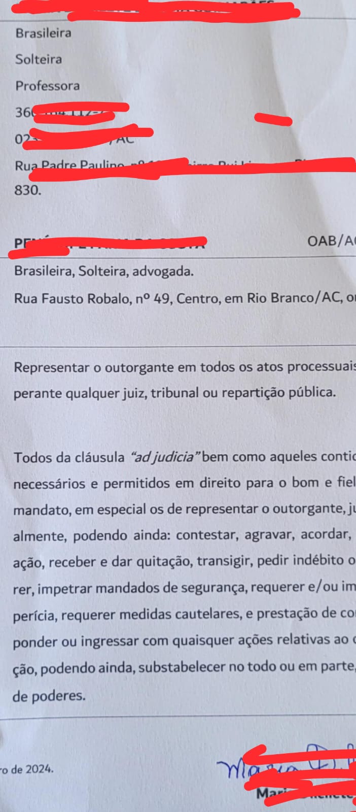 Vítima – Mandei mensagem pro Ricardo na mesma hora e perguntei o que estava acontecendo. O Ricardo nem sabia que o cara tinha sido chamado na defensoria e oferecido acordo. Ele não sabia de nada. Procurei o documento e vi os dados da tal sócia que ele tinha colocado como responsável, já que ela também não aparecia no processo como minha representante legal, embora a procuração que minha mãe assinou tenha essa advogada como outorgante.