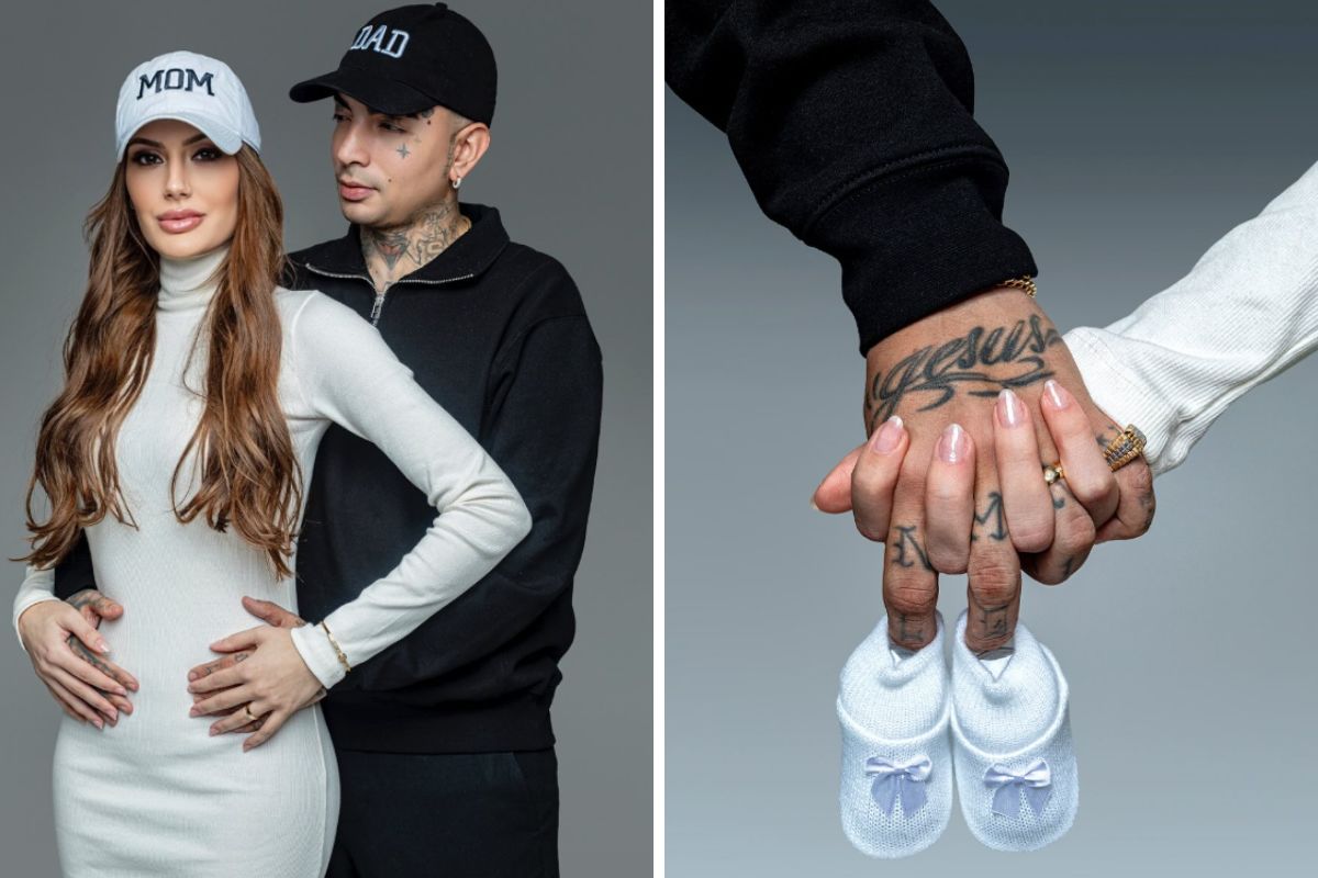 Nas imagens divulgadas, os dois aparecem usando bonés com as palavras “pai” e “mãe” (em inglês), se beijam, exibem um teste de gravidez positivo e mostram um sapatinho branco de bebê.