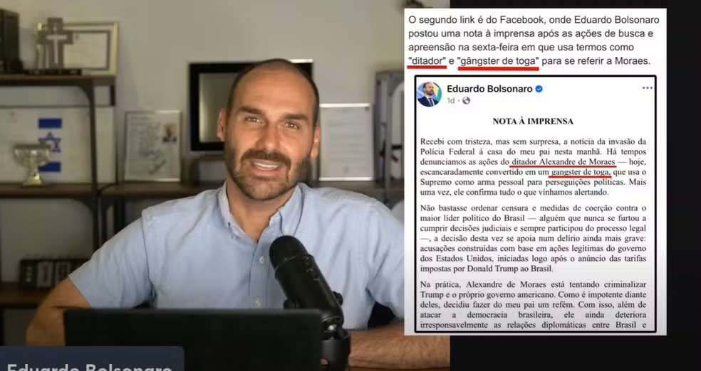 A fala foi feita após Eduardo afirmar que pretende trabalhar para retirar o ministro Alexandre de Moraes do Judiciário, reforçando o tom de confronto com o Supremo Tribunal Federal (STF).