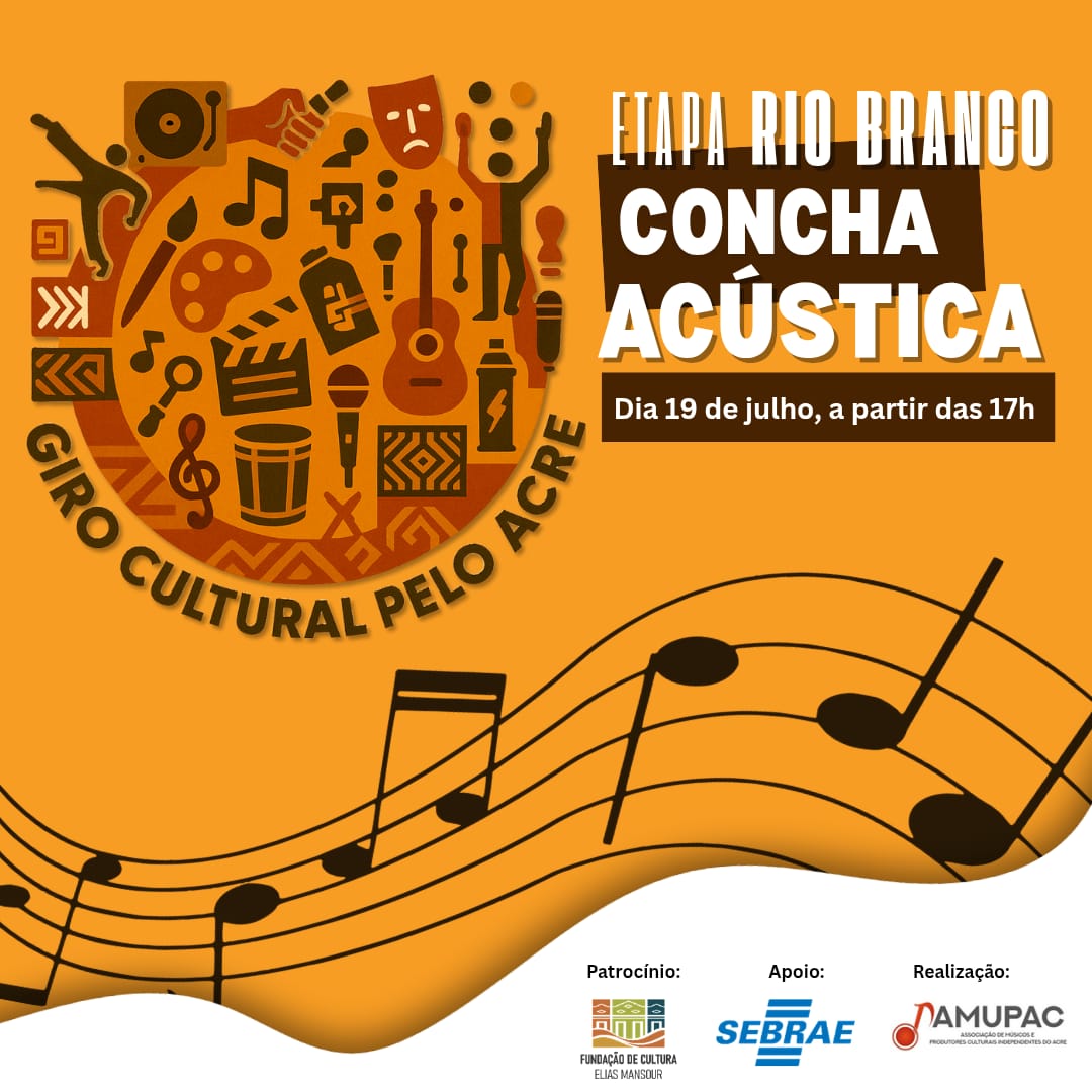 No próximo dia 19 de julho, a partir das 17h, a Concha Acústica de Rio Branco será palco da etapa do Giro Cultural pelo Acre, projeto realizado pela Associação dos Músicos e Produtores Culturais Independentes do Acre (Amupac), que propõe a circulação de expressões culturais e artísticas em Rio Branco e Cruzeiro do Sul, financiado pelo Fundo Estadual de Cultura (Funcultura), por meio da Fundação de Cultura Elias Mansour (FEM).