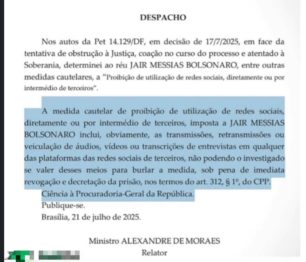[21/7 13:08] João Site: No novo despacho, o relator deixa explícito que essa proibição abrange “transmissões, retransmissões ou veiculação de áudios, vídeos ou transcrições de entrevistas em qualquer das plataformas das redes sociais de terceiros”.