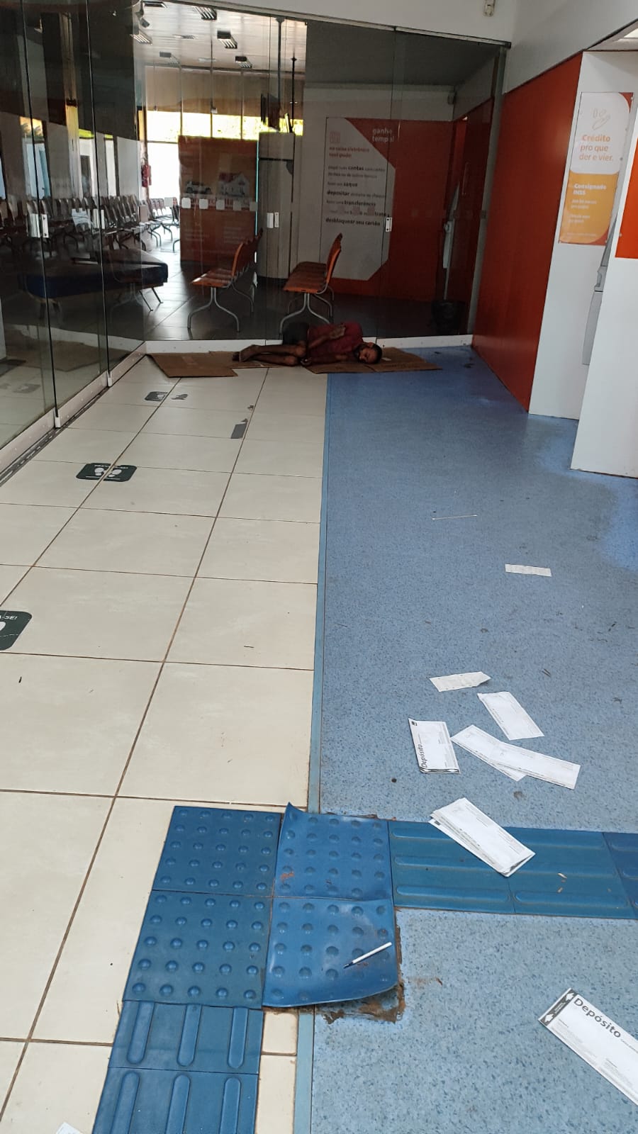 O ambiente é climatizado, o que atrai os moradores de rua, que dormem ali mesmo. Imagens mostram documentos do banco jogados pelo chão e manchas do que parece ser um líquido amarelo sobre o tapete.