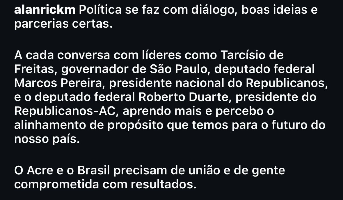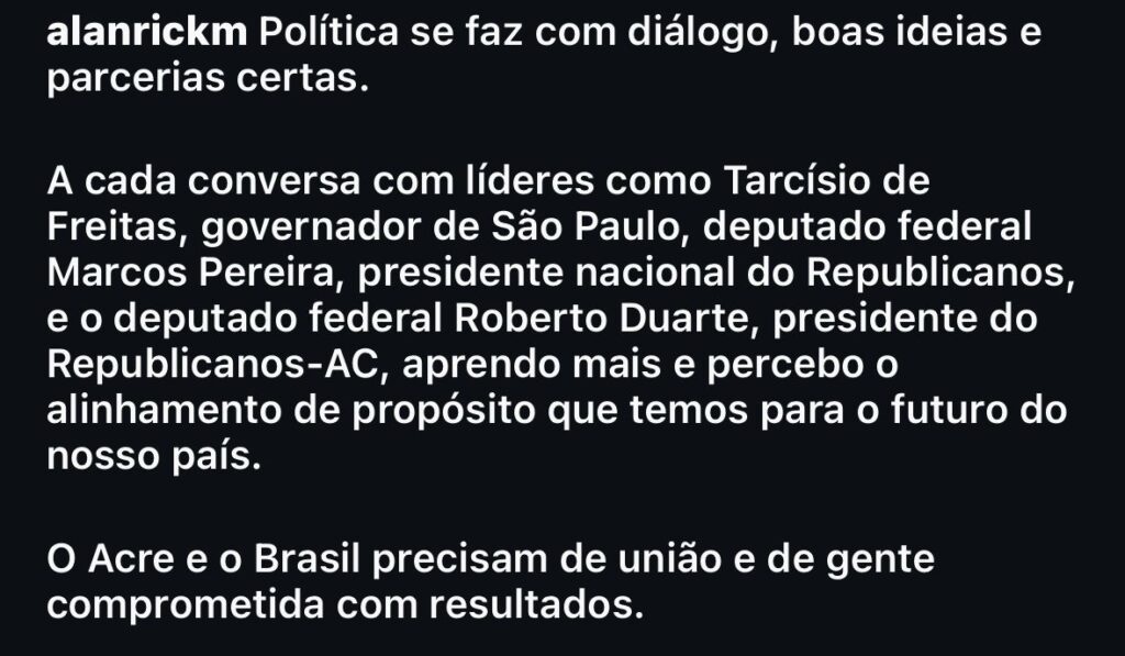 O senador sinalizou estar prestes a ser filiar ao Republicanos. Ele próprio admitiu a possibilidade ao publicar, nesta manhã, uma imagem em que aparece com o presidente nacional da legenda, o deputado federal Marcos Pereira. A saída do União Brasil, no entanto, é questão de tempo, considerando a falta de espaço para o senador na federação com o Progressistas, que tem a vice-governadora Mailza Assis praticamente aclamada a pré0candidata a governadora do Acre em 2026.