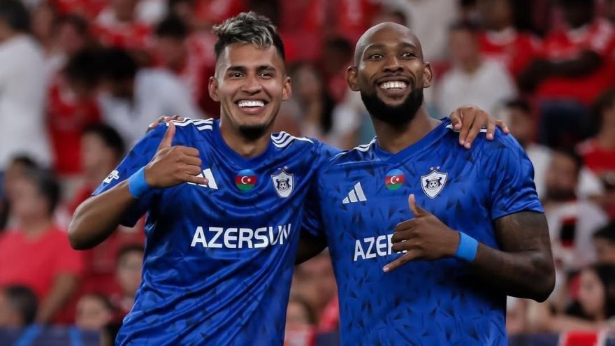 1 de 5Joagdores do Qarabag comemorando um dos seus gols na vitória sobre o Benfica pela Champions League • Reprodução/Instagram/@fkqarabagh