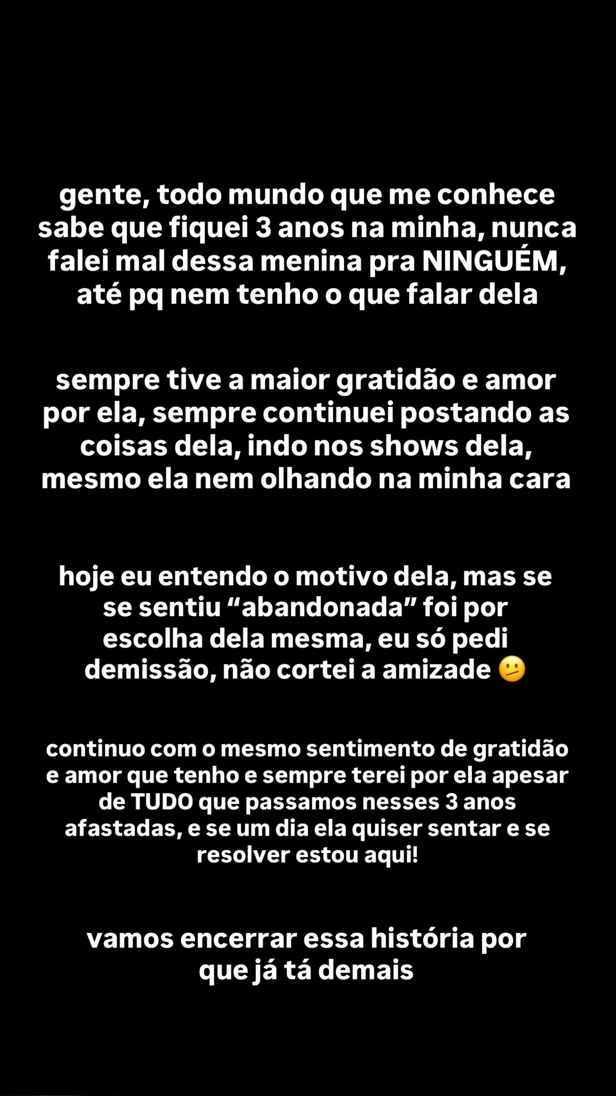 “Todo mundo que me conhece sabe que fiquei três anos na minha, nunca falei mal dessa menina para ninguém, até porque nem tenho o que falar dela. Sempre tive a maior gratidão e amor por ela, sempre continuei postando as coisas dela, indo nos shows, mesmo ela nem olhando na minha cara.”