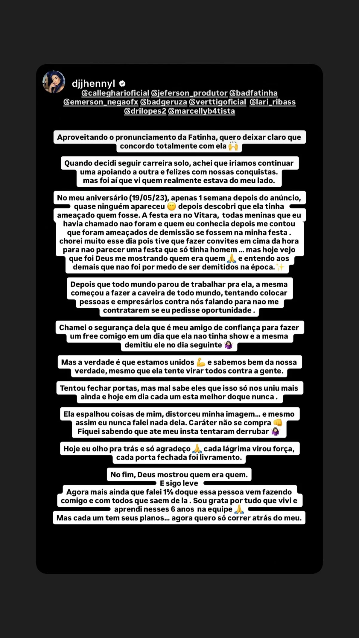 Após a fala da cantora, Fatinha, que fez parte da equipe de MC Mirella, publicou um texto nas redes sociais. Em um longo desabafo, a ex-assistente acusou a artista de ingratidão e de não aceitar pedidos de demissão.