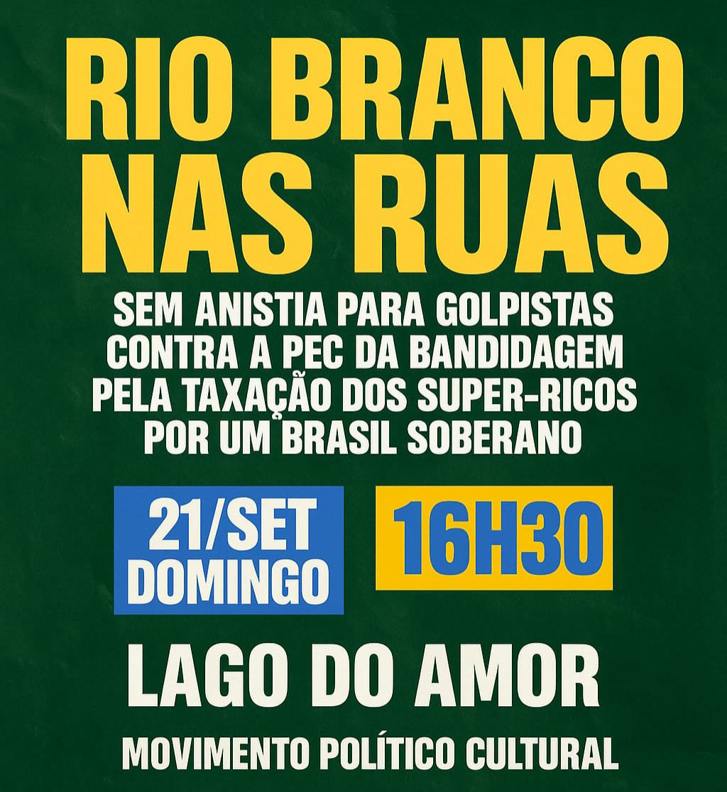 Rio Branco entrou na lista de capitais que terão manifestações neste domingo (21/9) contra a aprovação do PL da Anistia e da PEC da Blindagem. Os atos são organizados por movimentos ligados à esquerda e serão realizados em todas as regiões do Brasil.