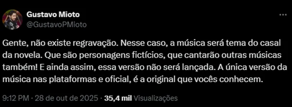 “Gente, não existe regravação”, escreveu Mioto no X, antigo Twitter. “Nesse caso, a música será tema do casal da novela. Que são personagens fictícios, que cantarão outras músicas também! E ainda assim, essa versão não será lançada. A única versão da música nas plataformas e oficial, é a original que vocês conhecem”, explicou.