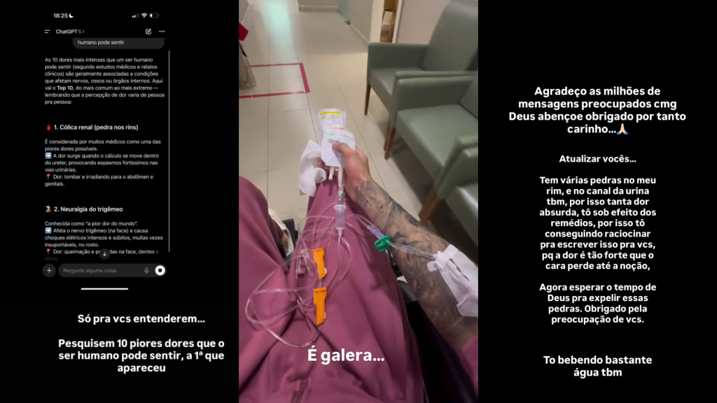 Antes de falar com seus seguidores, Luan mostrou uma pergunta que fez ao ChatGPT sobre as dores mais intensas que o ser humano pode sentir e em primeiro lugar na resposta veio a de cálculo renal.
