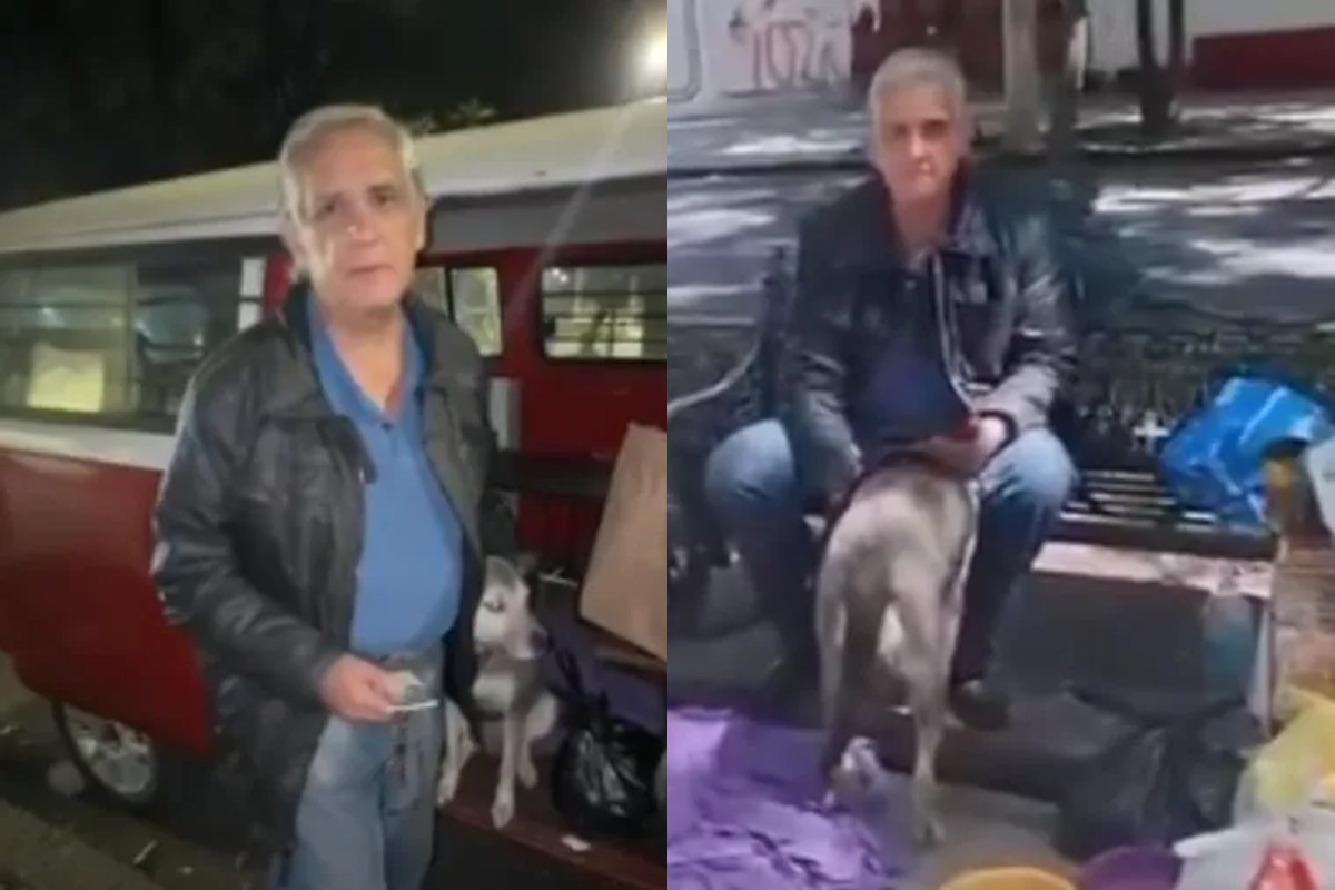 Nas imagens, ele aparece sentado em um banco de uma praça na Cidade do México com vários pertences e os animais de estimação. São quatro gatos e um cachorro. Confira.