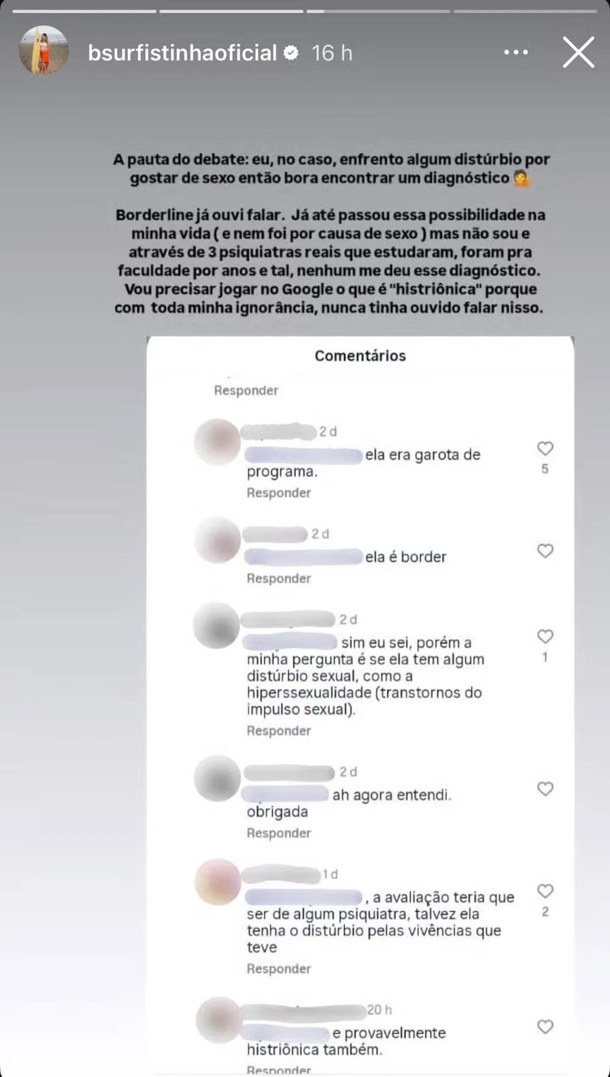 “Tem uma galera querendo encontrar diagnóstico para mim”, escreveu. “A pauta do debate: eu, no caso, enfrento algum distúrbio por gostar de sexo, então bora encontrar um diagnóstico.”