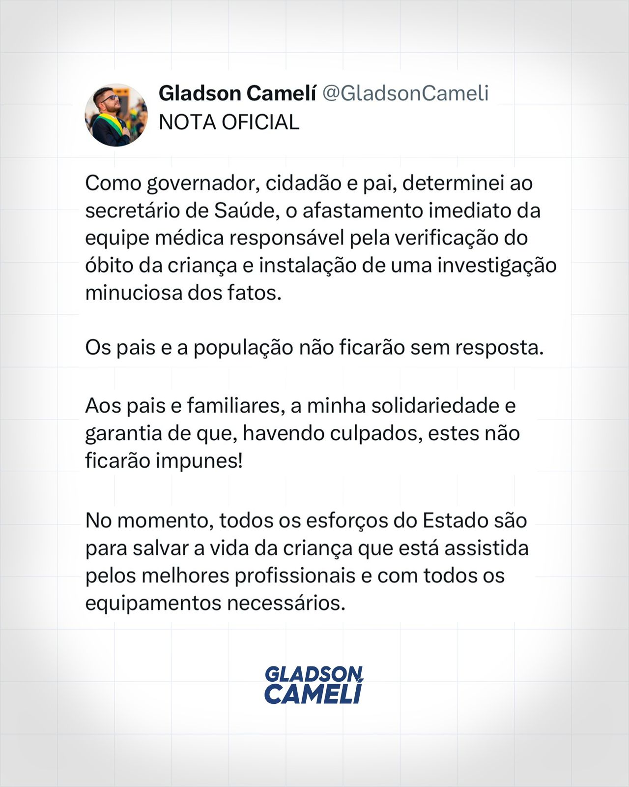 Em nota, há pouco, na sua rede social, o governador Gladson Cameli disse ter determinado o afastamento da equipe médica que trabalhou no caso do bebê que teve morte declarada, mas acordou em seu próprio velório, minutos antes de ser sepultado vivo. Os médicos atuam na Maternidade Barbara Heliodora, para onde a criança foi levada de volta após seus sinais vitais serem confirmados. O secretário de Saúde, Pedro Pascoal, acompanha a sindicância aberta na maternidade para apurar respondabilidades.