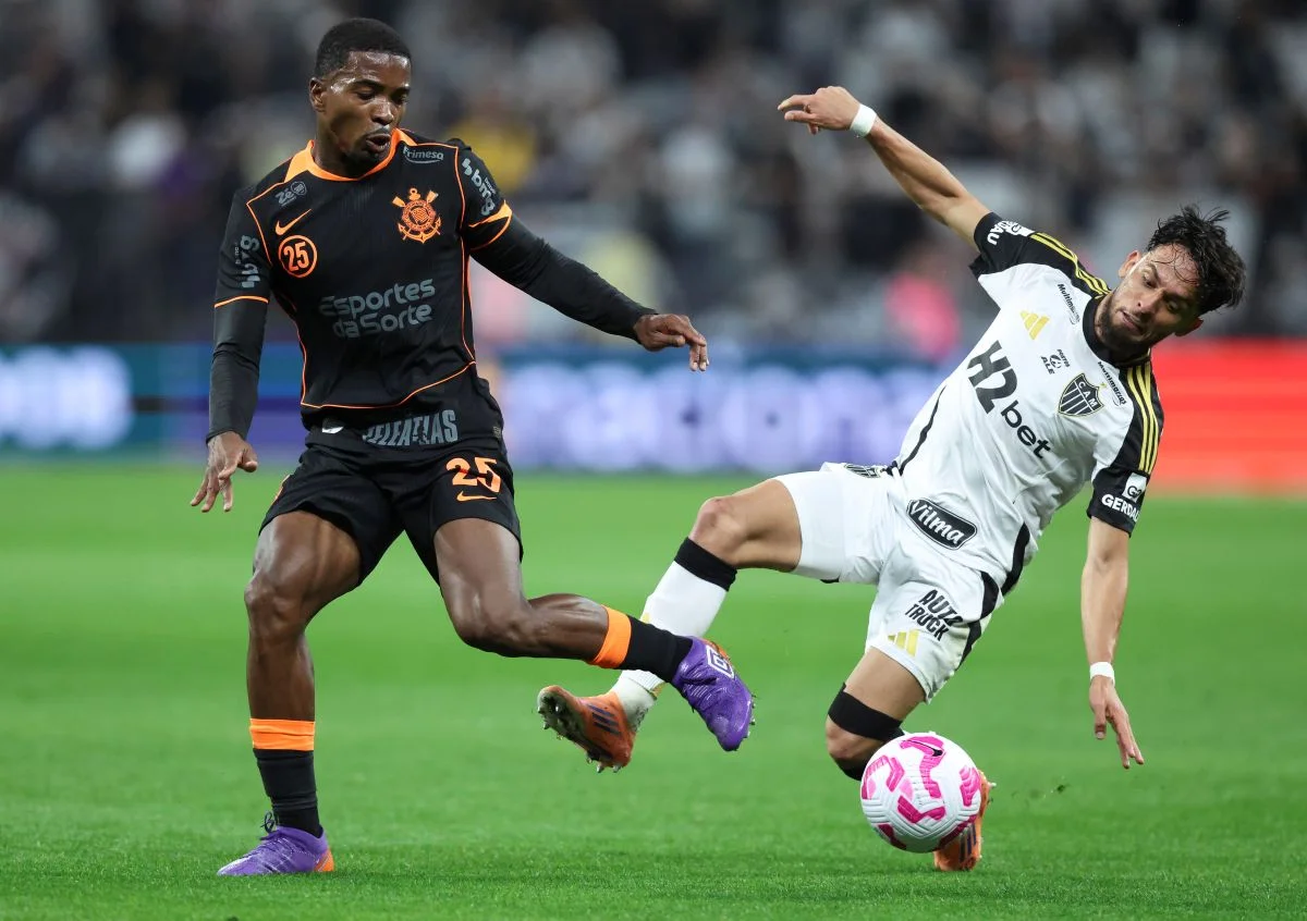 A partida entre os clubes alvinegros começou morna e bastante faltosa. O Atlético-MG teve as primeiras finalizações do confronto, mas sem muito perigo ao gol de Hugo Souza. Durante o primeiro tempo, as melhores oportunidades de balançar as redes foram do Corinthians.
