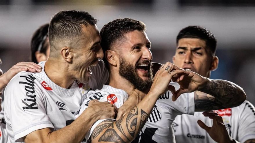 1 de 6Álvaro Barreal celebrando o seu gol em Santos x Corinthians, pelo Brasileirão • Miguel Schincariol/Getty Images