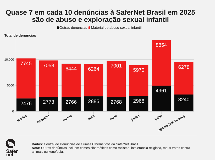 Entre 1º de janeiro e 31 de julho de 2025, a SaferNet recebeu 76.997 denúncias de crimes digitais, sendo 49.336 (64%) relacionadas a abuso e exploração sexual infantil — quase sete em cada dez notificações.