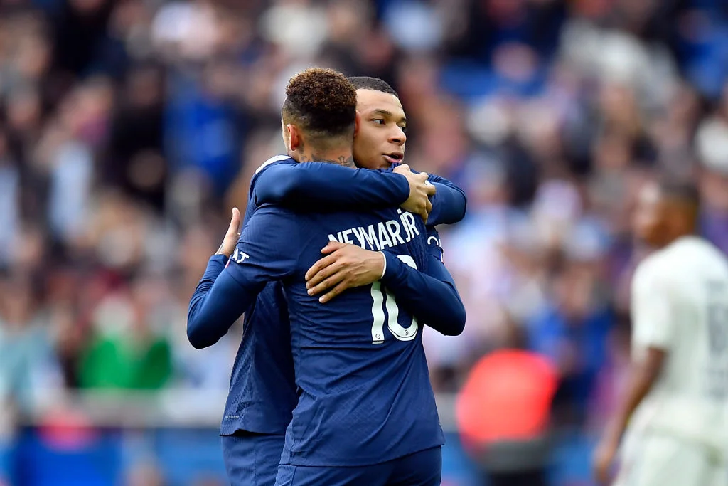 PARIS, FRANCE – FEBRUARY 19: Neymar Jr of Paris Saint-Germain is congratulated by teammate Kylian Mbappe after scoring during the Ligue 1 match between Paris Saint-Germain and Lille OSC at Parc des Princes on February 19, 2023 in Paris, France.