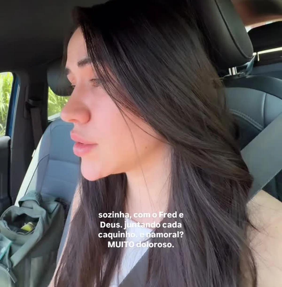 “Sozinha, com o Fred e Deus. Juntando cada caquinho. E namoral? Muito doloroso”, escreveu ela, segurando as lágrimas, dentro de um carro.