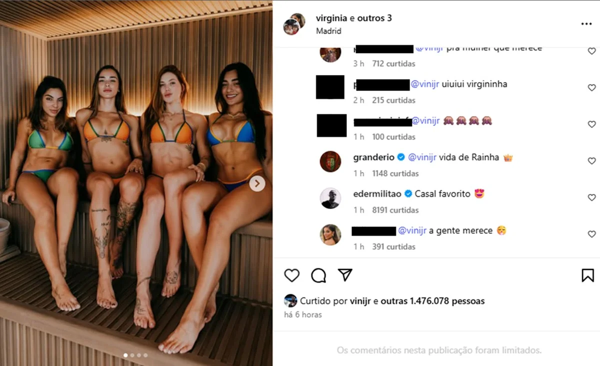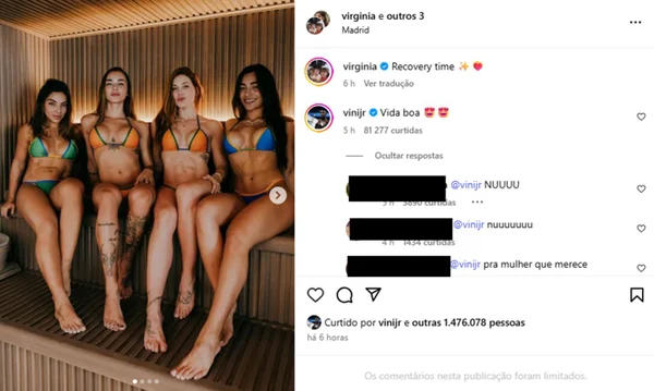 Na imagem, Virginia aparece em uma sauna com Tainá Militão, Duda Freire e Lídia Souza. “Recovery time”, legendou ela. Vini Jr., então, reagiu e com duas carinhas com olhos de coração e as seguintes palavras: “Vida boa”.