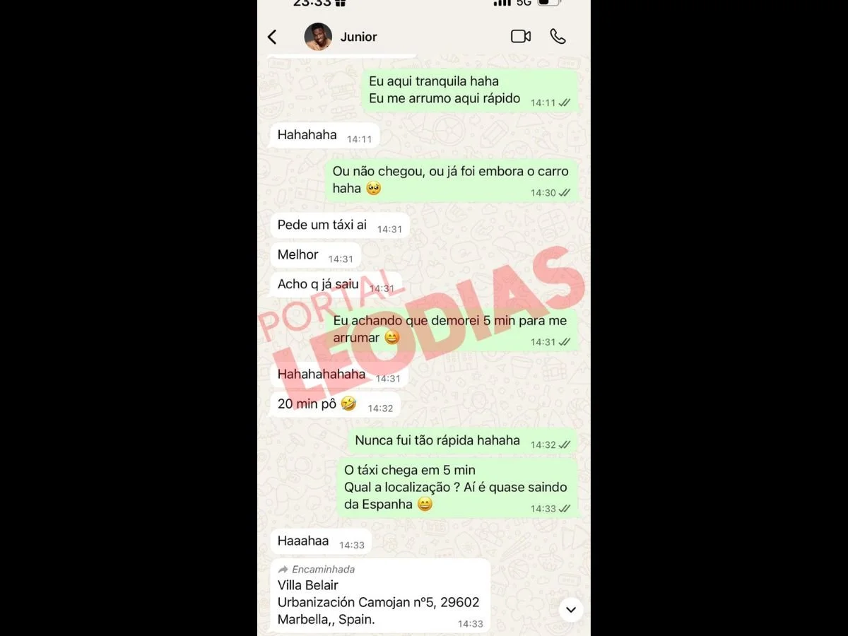 As trocas incluem também registros de ligações e mensagens sobre hospedagem. Em maio, o atleta teria escrito: “Deixa eu ver sobre o hotel e te aviso”, ao que Day respondeu no dia seguinte com elogios: “Você fica lindo de smoking”, acompanhado de emojis apaixonados. Em seguida, ele pede os dados do passaporte dela, e ela confirma o envio.