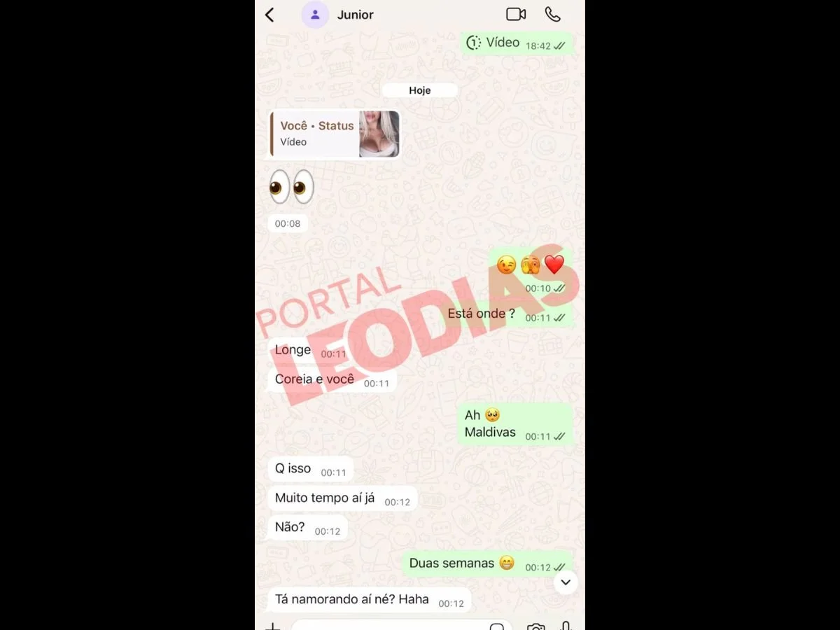 Em um diálogo mais recente, o atacante teria respondido a um vídeo postado por Day com um emoji de olhos. Questionado por ela sobre onde estava, ele responde: “Longe. Coreia e você?”. A modelo afirma estar nas Maldivas, e o jogador rebate em tom de brincadeira: “Tá namorando aí, né? Hahaha”.