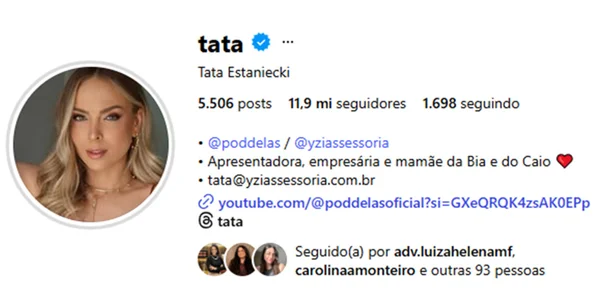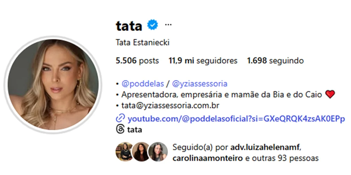 Anteriormente, a biografia dela no Instagram aparecia como “Tata Estaniecki Cocielo”. Agora, aparece apenas como “Tata Estaniecki“.