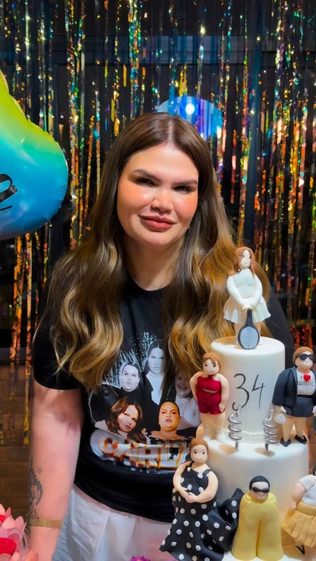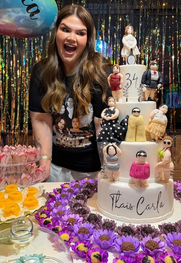 O que mais chamou atenção foi o bolo de quatro camadas, decorado com miniaturas da aniversariante em diferentes fases da vida. A própria Thais se surpreendeu com o capricho: “Cheguei aqui e, do nada, festa surpresa. Com direito a blusinha personalizada e tudo. Olha meu bolo! Chocada!”, contou.
