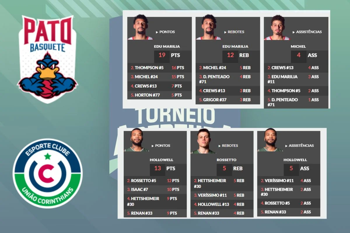 Na sequência do Torneio Abertura NBB, o Pato Basquete derrotou o União Corinthians por 74 x 68, nesta sexta-feira (3/10), garantindo a sétima colocação no campeonato. A partida foi disputada na Arena BRB Nilson Nelson. Esta foi a última partida dos times no campeonato.