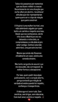 “Quero pedir desculpas publicamente, com o coração aberto, porque entendi que relação de verdade só existe quando há respeito, confiança e transparência. A ideia agora é zerar tudo. Sem mentiras, sem brigas, sem máscaras. Com muito amor, carinho e respeito.”