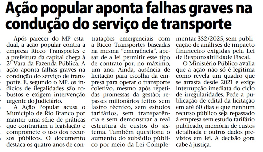 Uma ação popular recheada de indícios de ilegalidades, finalmente, chegou à 2ª Vara da Fazenda Pública, com parecer do Ministério Público pedindo a condenação do município, e citando, dentre falhas graves na condução do serviço de transporte, sérios e robustos indícios de ilegalidades que justificam a intervenção urgente do Judiciário. O primeiro contrato foi assinado em fevereiro de 2022, quando Bruna, representando o seu pai,  disse que a empresa trouxe para Rio Branco 60 ônibus para operar em 31 linhas na capital.