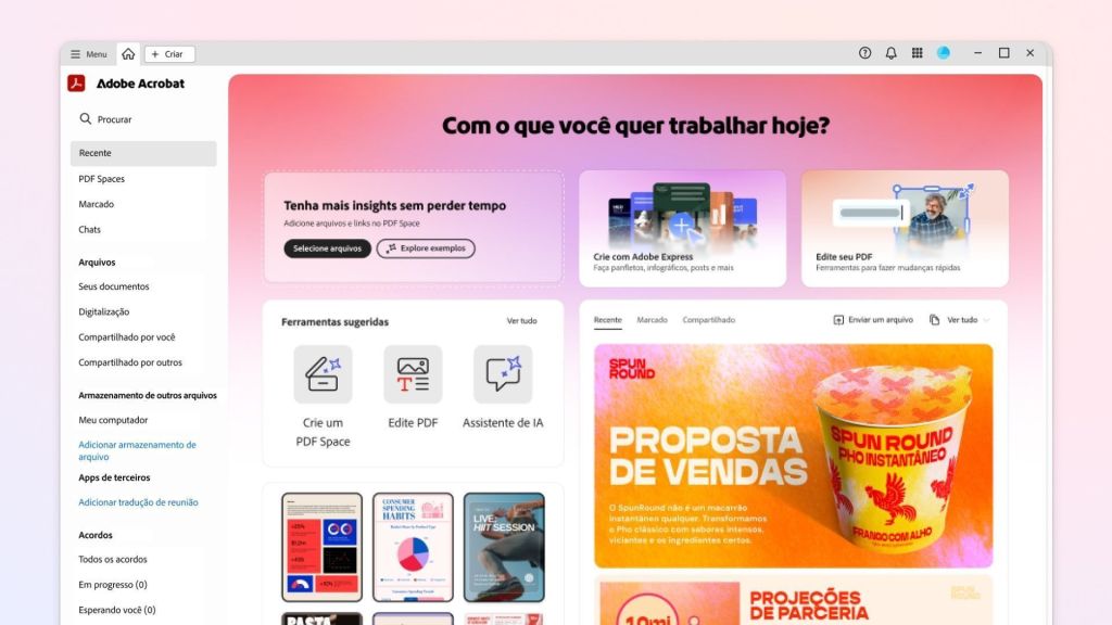 OAcrobat Studio traz o recurso PDF Spaces que permite reunir mais de 100 arquivos, links e páginas da web em um mesmo ambiente, no qual equipes podem interagir, comparar e resumir documentos com o apoio de agentes de IA. Esses assistentes podem ser configurados para diferentes funções: como instrutor, analista ou consultor, a depender do projeto que deseja executar.