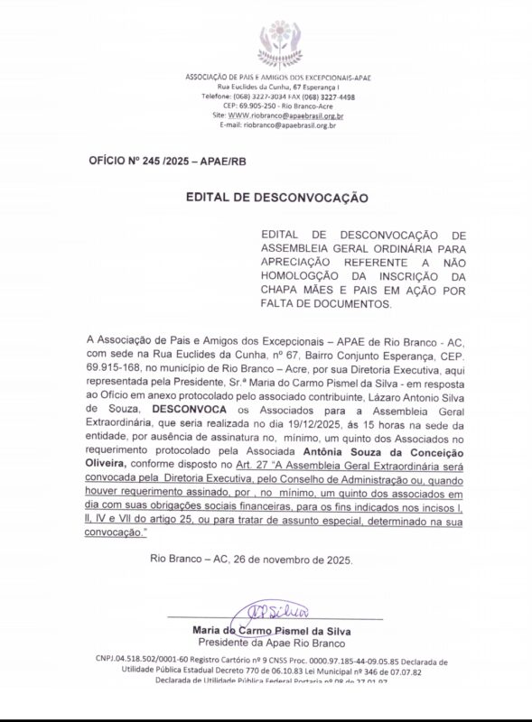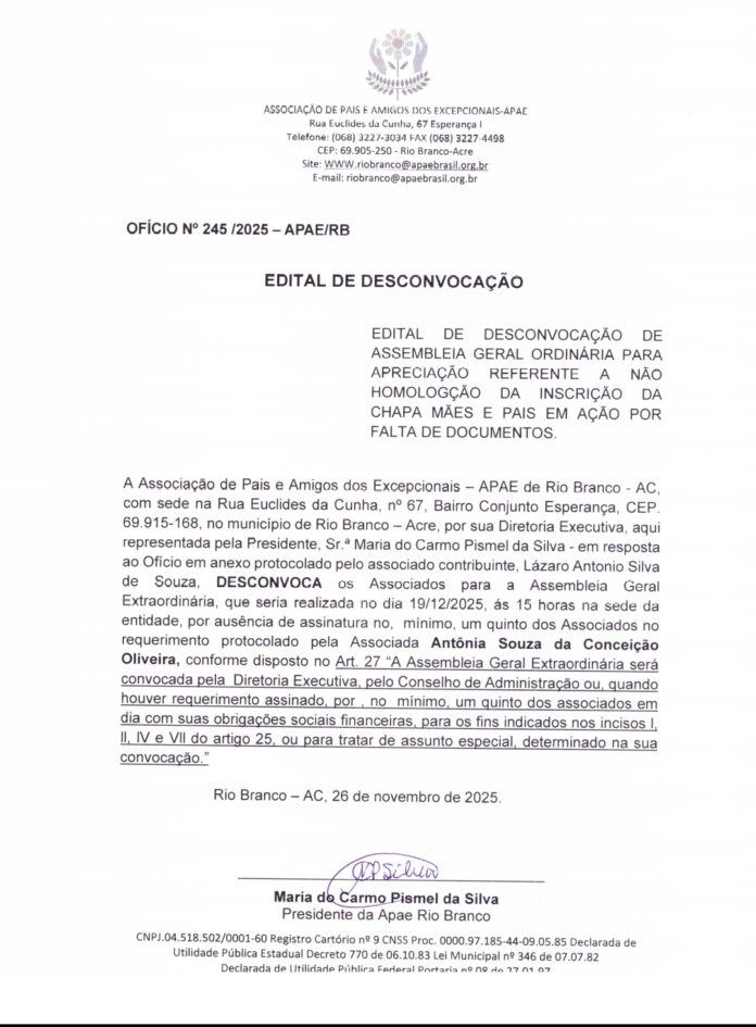 geral REDAÇÃO 26 de novembro de 2025 APAE Rio Branco desconvoca assembleia geral extraordinária; Confira o edital Share FacebookTwitterPinterestWhatsApp Previous articleAtor e dublador Tony Germano morre aos 55 anos após cair de lajeNext articleArsenal vence Bayern com gol brasileiro e é líder da Champions League Conselho aumenta limite para uso do FGTS em compra de imóveis Metropoles - 26 de novembro de 2025 Nesta quarta-feira (26/11), o Conselho Curador do Fundo de Garantia do Tempo de Serviço (FGTS) liberou o uso do fundo para todos os contratos... Haddad adota tom de campanha e enaltece Lula por isenção no IR Metropoles - 26 de novembro de 2025 O ministro da Fazenda, Fernando Haddad, ressaltou a liderança do presidente da República, Luiz Inácio Lula da Silva (PT) em discurso durante a cerimônia... “Stranger Things”: relembre itens marcantes da série CNN - 26 de novembro de 2025 Já se passaram quase dez anos desde a estreia de “Stranger Things”, quando os fãs foram transportados para a década de 1980 e para...