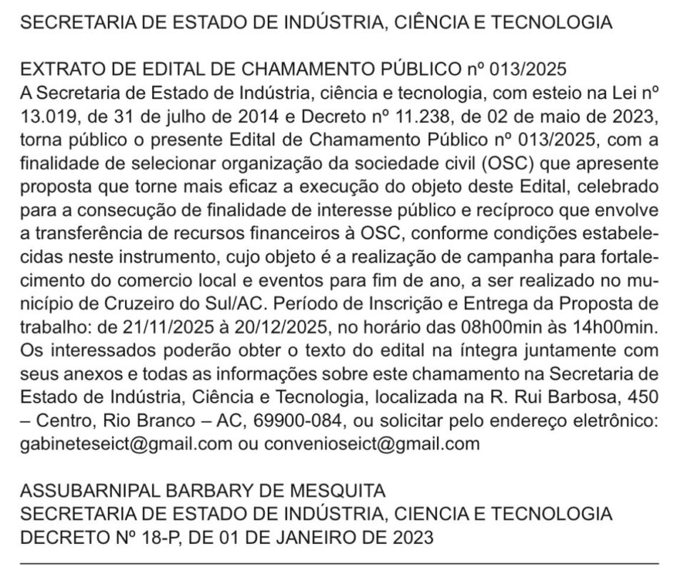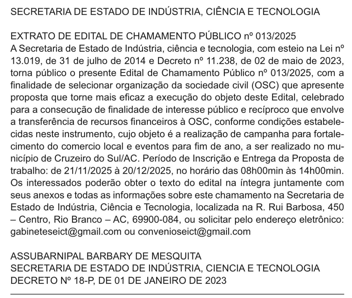 Um edital publicado no Diário Oficial do Estado (DOE) convoca Organização de Sociedade Civil (OSC´s) que estejam interessadas em realizar “campanhas de fortalecimento do comércio local e eventos de fim de ano”. O edital é assinado pelo secretário Assurbanípal Mesquita (Ciências e Tecnologias), que exonerou um dos envolvidos no escândalo, John Lisboa, do cargo em comissão que ocupava naquela secretaria até o momento em que foi preso. As propostas devem ser apresentadas até 20 de dezembro para análise e os custos totais, bancados com recursos públicos, estão estimados em R$ 7 milhões. O modelo de contratação é o mesmo de dois anos atrás, quando o repasse financeira foi feito em questionado convênio com a Casa da Amizade.