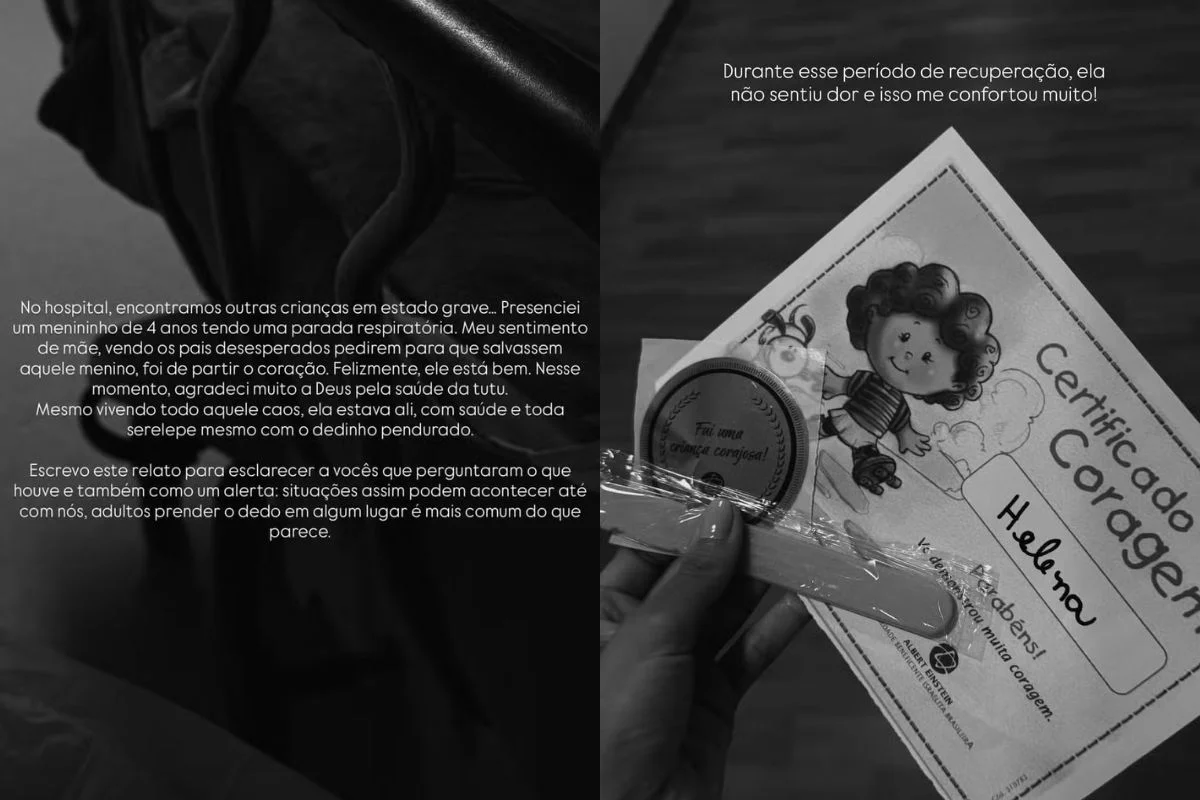O susto foi grande para a mãe da filha do craque. Helena precisou fazer um procedimento cirúrgico de emergência. “Felizmente, ela está bem. Nesse momento, agradeci muito a Deus pela saúde da tutu. Mesmo vivendo todo aquele caos, ela estava ali, com saúde e toda serelepe, mesmo com o dedinho pendurado”, contou.