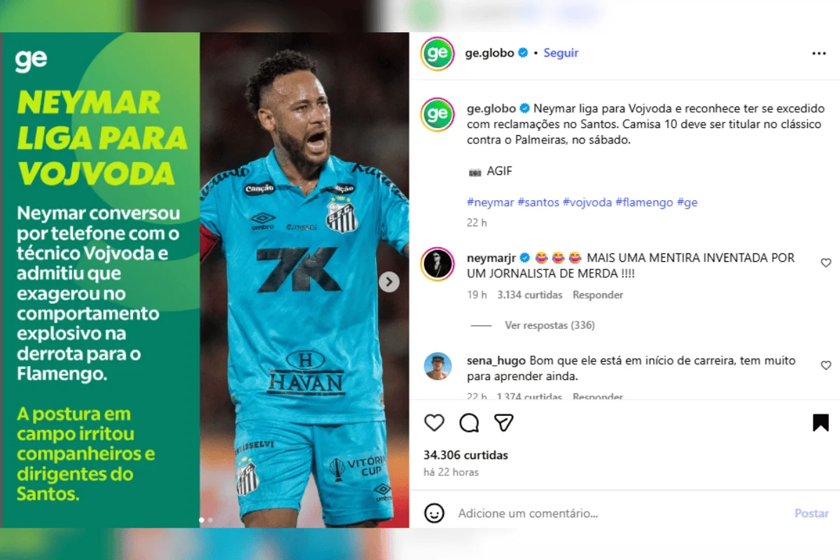 Mais uma polêmica de Neymar. Na terça-feira (11/11), o craque do Santos utilizou as redes sociais para responder uma reportagem do GE. Na postagem, o atacante criticou a matéria publicada e negou que tenha ligado e pedido desculpas ao técnico Juan Pablo Vojvoda.
