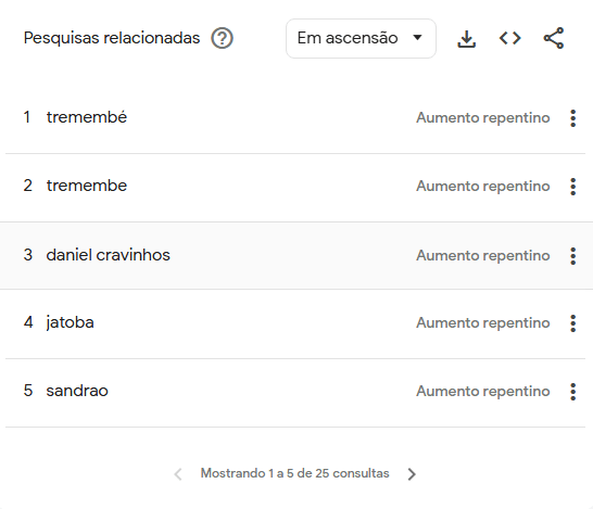 Entre as pesquisas relacionadas ao assunto, estão “Tremembé”, “Daniel Cravinhos”, “Jatobá” e “Sandrão”, que apresentaram um aumento repentino nas buscas no período analisado (de 29 de outubro a 4 de novembro).