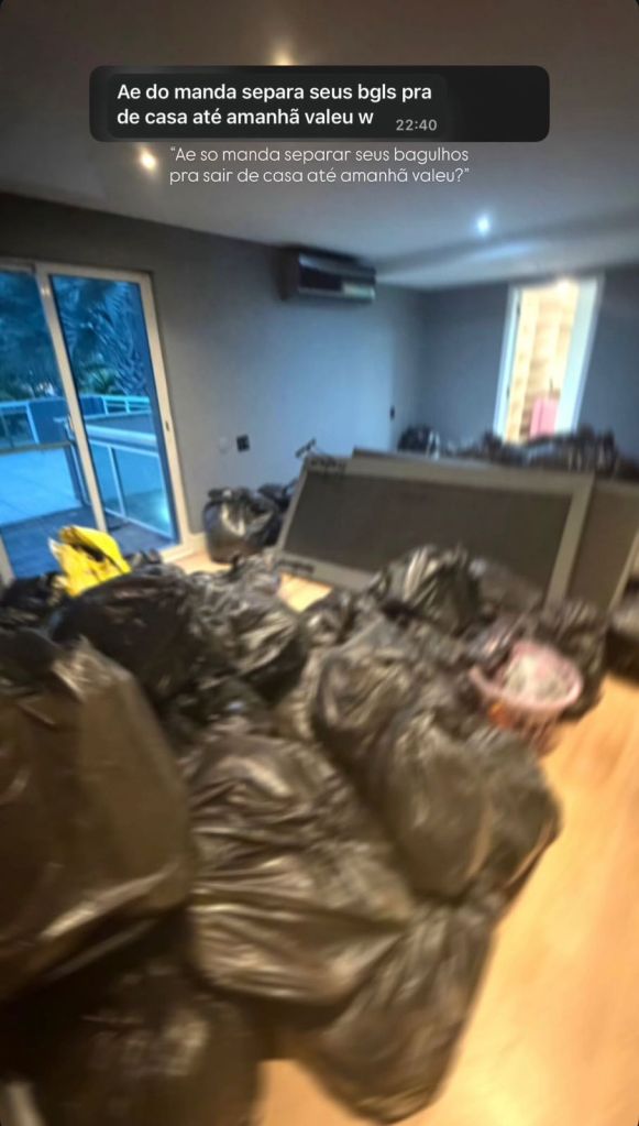 Além disso, em outro story, ela postou fotos dos sacos de lixo com um print de uma mensagem que, supostamente, seria de Poze do Rodo. “Ae, só manda separar seus bagulhos para sair de casa até amanhã, valeu?”, disse ele.