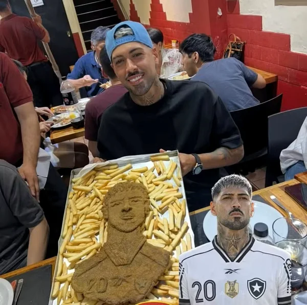O zagueiro Alexander Barboza, do Botafogo, foi surpreendido durante a folga da Data Fifa com uma homenagem inusitada em Buenos Aires. O restaurante El Antojo Núñez, que o argentino costuma frequentar há anos, preparou um bife à milanesa moldado com o formato de seu rosto.