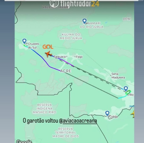 A Gol arremeteu seu Boeing procedente de Cruzeiro do Sul no início da tarde desta segunda-feira, após chegar à metade da viagem com destino a Rio Branco. “O bebezão voltou”, indica a legenda de uma página na Web que mostra a movimentação das aeronaves no espaço aéreo acreano em tempo real. Passageiros que aguardavam embarcar na capital acreana com destino a Brasília permaneciam no saguão do aeroporto até por volta das 16:30h. A Gol não confirmou que o voo será completado ainda hoje.