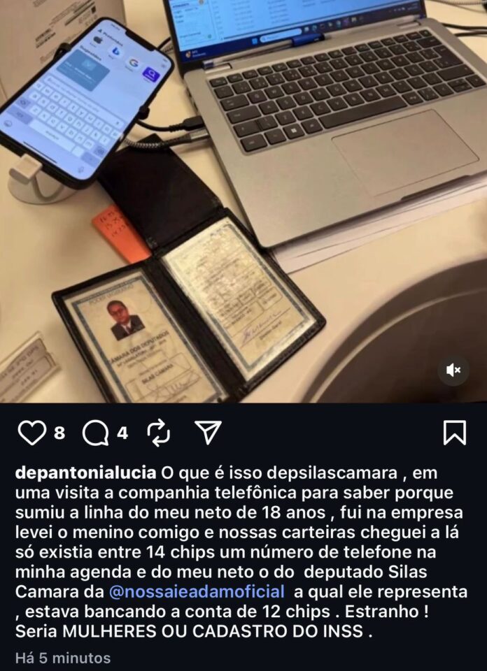 O que é isso depsilascamara , em uma visita a companhia telefônica para saber porque sumiu a linha do meu neto de 18 anos, tui na empresa levei o menino comigo e nossas carteiras cheguei a la só existia entre 14 chips um número de telefone na minha agenda e do meu neto o do deputado Silas Camara da @nossaieadamoficial a qual ele representa , estava bancando a conta de 12 chips. Estranho !