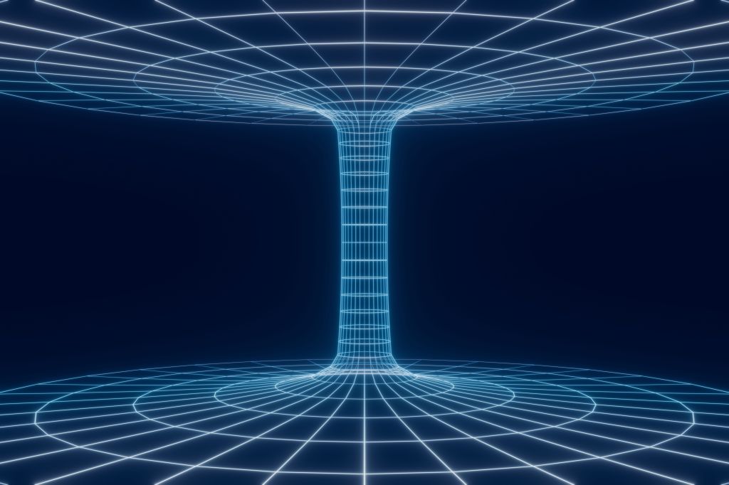 A ilustração representa um buraco de minhoca, um túnel hipotético através do espaço-tempo que conecta regiões distantes do universo • Getty Images