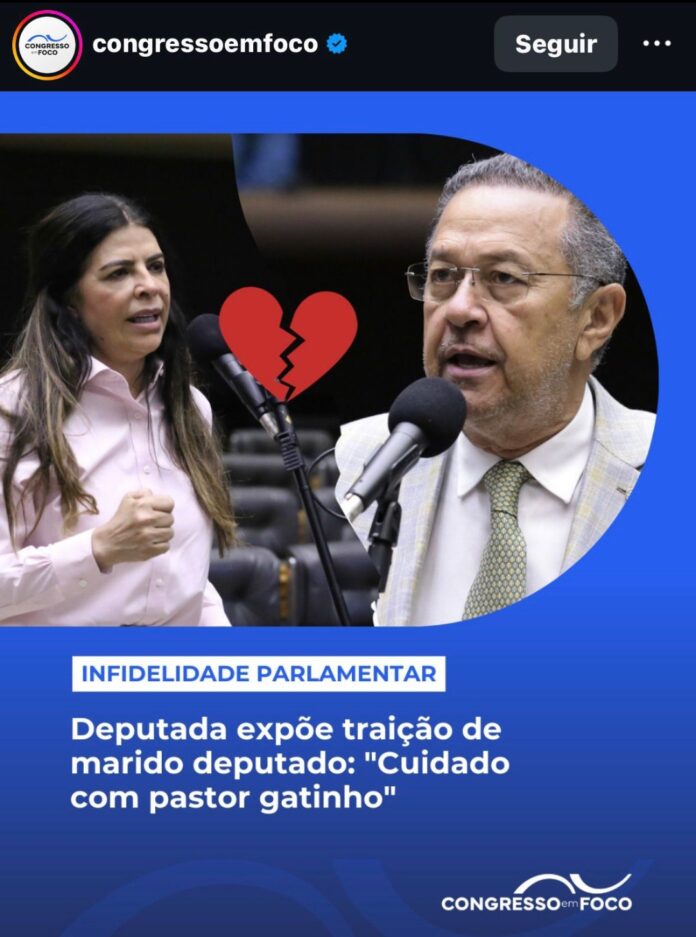 A deputada federal Antônia Lúcia (Republicanos-AC) tornou públicas acusações contra o marido, o também deputado Silas Câmara (Republicanos-AM), nesta terça-feira (2), ao atualizar sua biografia no Instagram. No espaço normalmente reservado a informações pessoais, ela escreveu: