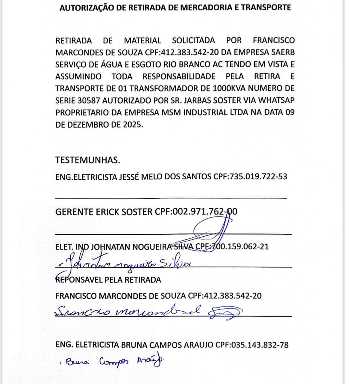 Um protocolo interno da empresa MSM Industrial LTDA (foto de capa) revela que dois engenheiros do Saerb e um motorista fizeram a retirada de um transformador, em caráter de cessão ou empréstimo, para corrigir uma grave falha elétrica na ETA II. A empresa pertence ao construtor Jarbas Soster, que atendeu ao pedido da prefeitura autorizando a retirada do equipamento num escritório localizado numa pedreira localizada à margem da BR 364, já em território do Estado de Rondônia.